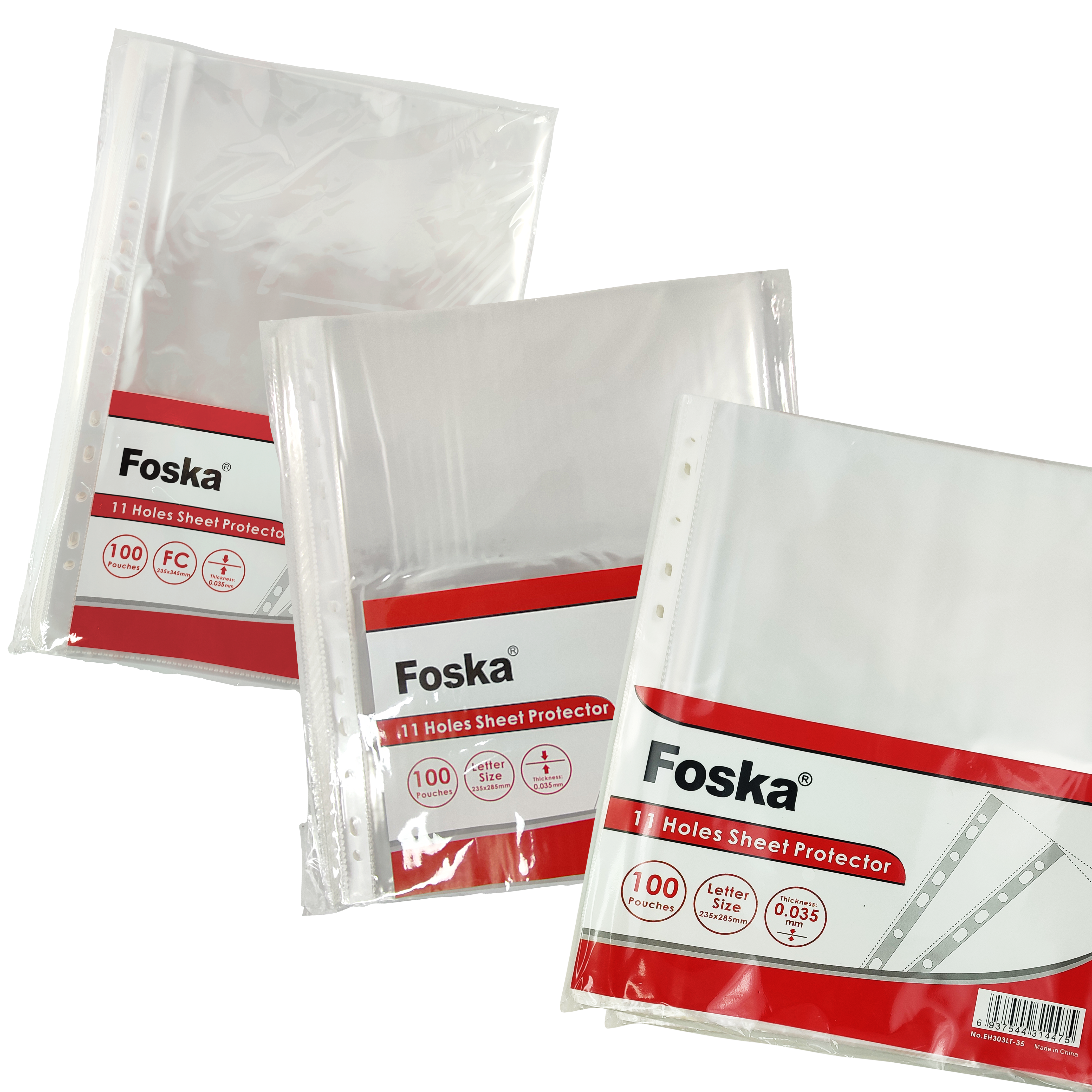 FUNDAS PROTECTORAS PLASTICAS (PP) P/CARPETAS `FK` PQ.100PZ.0.035mm.235X285MM.CARTA C/11 HUECOS