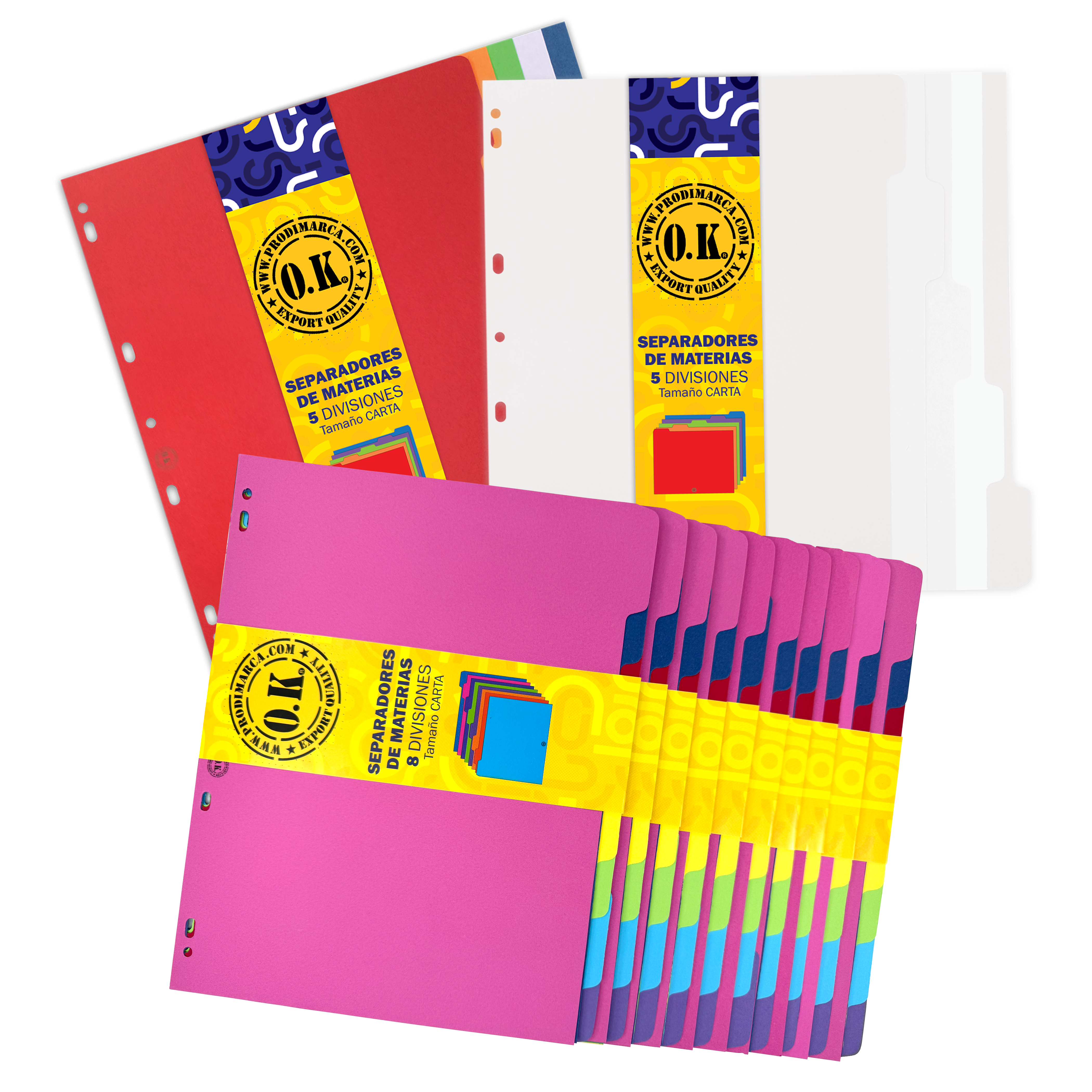 SEPARADORES DE 5 DIVISIONES `OK` COLOR 180gr.CARTA PQ.10jg.229x279mm.(9x11") P/MATERIAS